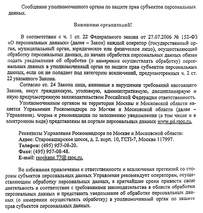 Сообщение Управления Роскомнадзора по Москве и Московской области