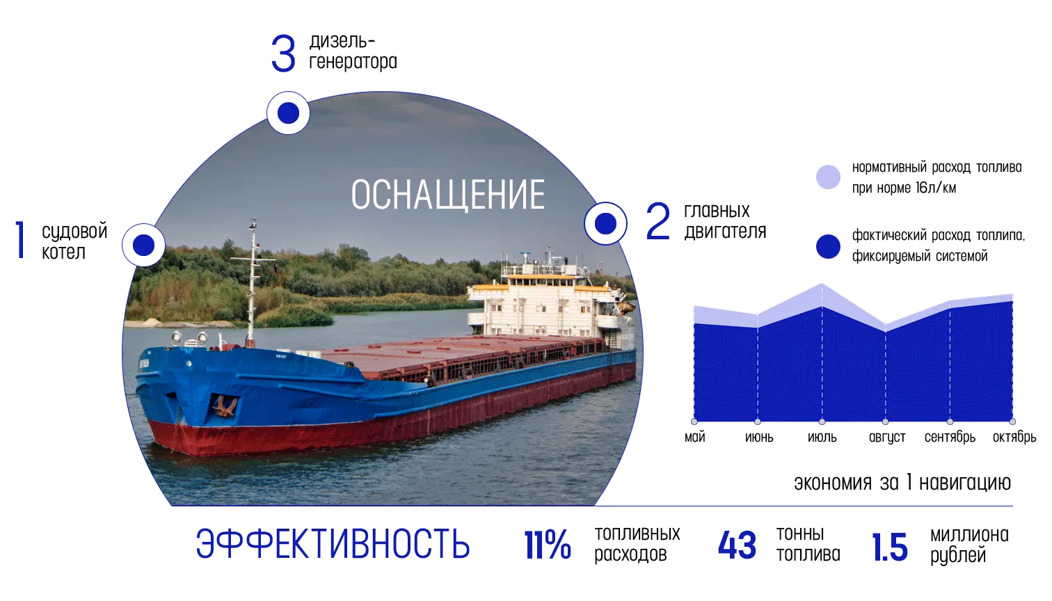 Система позволяет дистанционно отслеживать параметры основных судовых потребителей ГСМ, вести точный учет расхода топлива, контролировать бункеровку. Внедрение можно провести поэтапно, начав с установки датчиков для контроля наиболее критичных параметров судовых топливных систем.