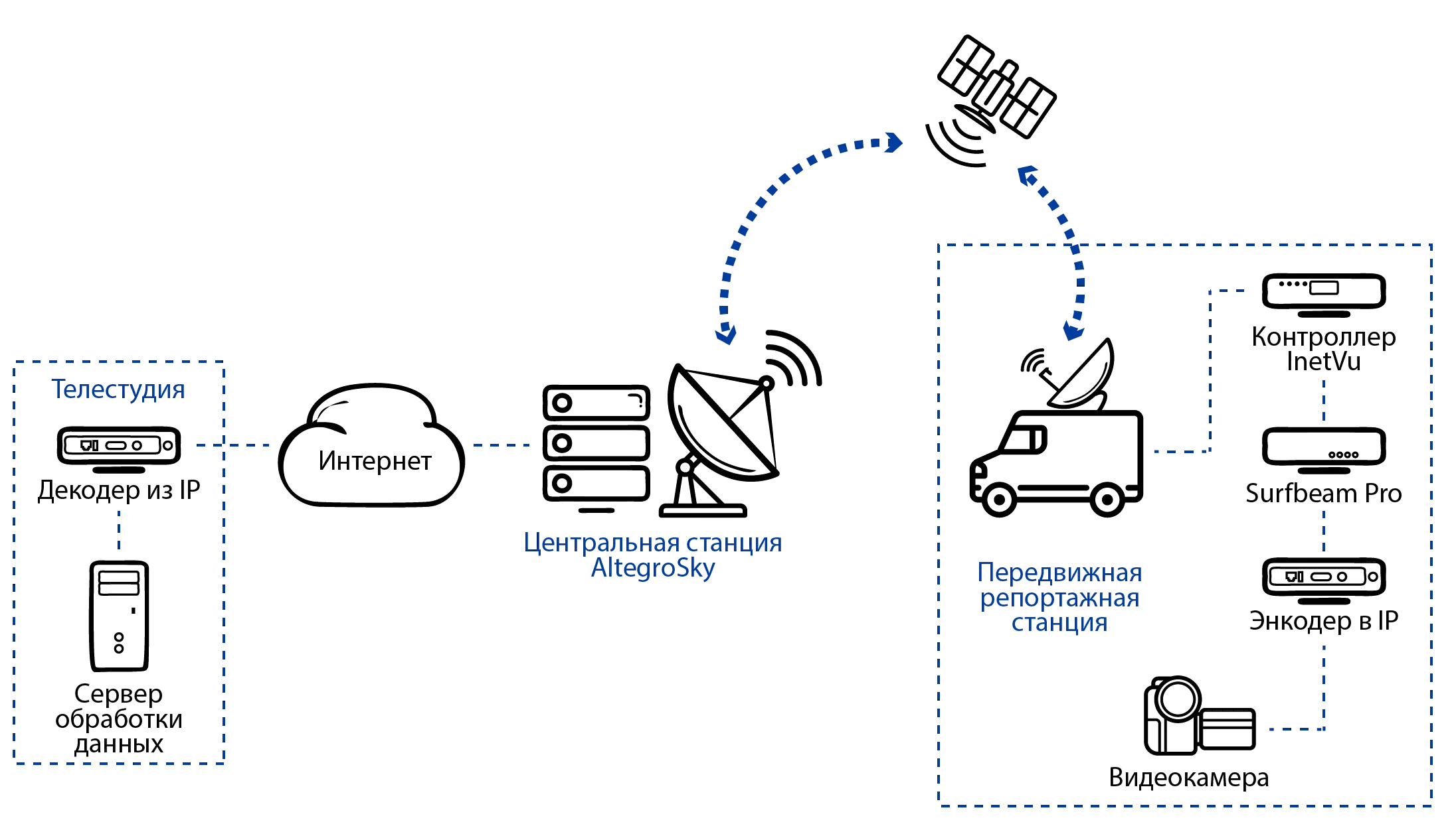 ГК AltegroSky обладает необходимыми ресурсами, чтобы организовывать беспрепятственный спутниковый доступ к телекоммуникационным сетям из любого уголка России. Для подключения канала связи с помощью передвижной репортажной станции мы используем платформы нового поколения, передающие информацию через спутники высокой емкости. Благодаря этому применяются антенны малого диаметра и веса, которые можно установить на любое транспортное средство. Питание оборудования осуществляется от внешнего источника либо от инвертора, интегрированного в автомобиль.