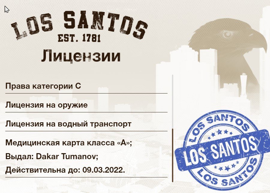 Ожидаем вас в здании Полицейского департамента, для дальнейшего собеседование. С собой иметь паспорт , пакет лицензия.Скрыть контент