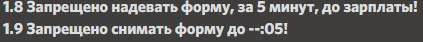 1. Ваш никнейм: James Mackey2. Ваш уникальный ID: AAF15B3. Никнейм администратора: [A] Euphoria4. Суть обжалования: Я работал в пд, мне пришлось отойти от компьютера и я снял форму, после 10-15 ти минут вернувшись к компьютеру я надеваю форму время было 12:51 или 12:52 что то около иду в кпз, начинаю разбираться что там и за что после чего время уже 13:03 я иду к складу и меня откидывают фарм зп5. Доказательства: На скрине то что можно надевать до 55 минуты.6. Примечания (дата, время бана и пр.): 24.11.2020 13:037. Хотите ли Вы увидеть доказательства своего нарушение: Да