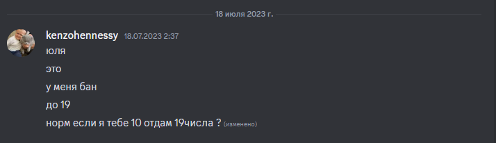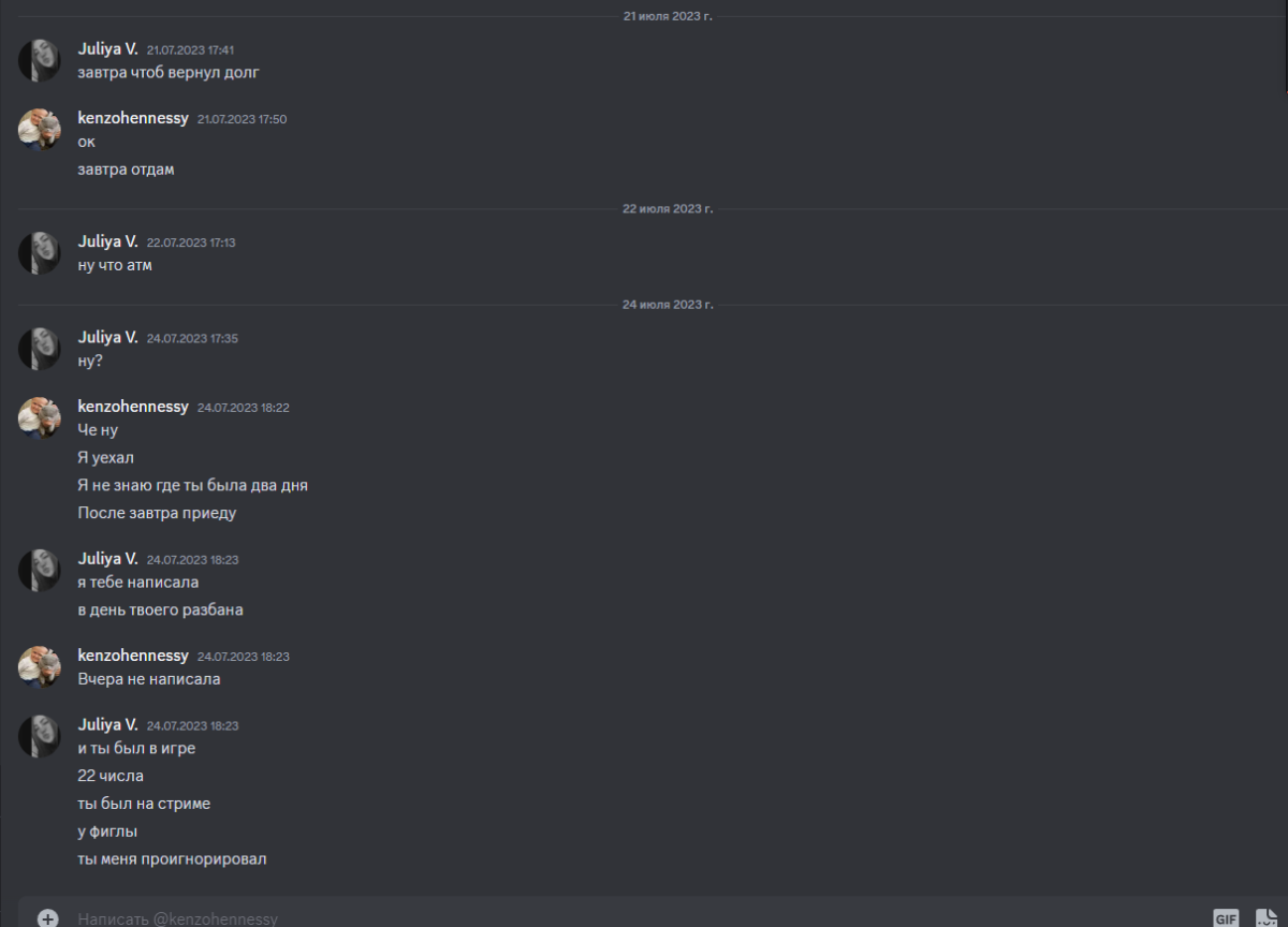 1. Ваш персональный ID: 681412. Персональный ID мошенника: 539313. Суть жалобы: Договорились с гражданином о том, что я продам ему audi r8 le за 26.000.000. и после этого он будет мне отдавать полную сумму (40.000.000) по частям. По его словам он должен был мне отдать 4.000.000 на следующий день, а остальные 10.000.000. в течении недели. На следующий день он отдал мне 4.000.000, а далее я просто ждала. 18.07.2023 данный гражданин попросил оттянуть срок отдачи долга, т.к. он попал в бан. По его словам 22.07.2023 у него должен был быть разбан, за день до этого я ему напомнила. В день его разбана я ему написала и осталась без ответа. Так же пробегали его друзья(знакомые) и говорили, что он мне 10.000.000. не отдаст( откат на это есть)4. Доказательства (скриншоты/видео):