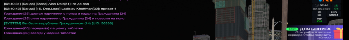 Ladislav Khoffman Игрок сервера 2 Дек 2021 811 20 Игровой никнейм Ladislav 2 Май 2022 #2 1. Ваш персональный ID: 59951 2. Персональный ID нарушителя: 56336 3. Суть жалобы: СК 4. Доказательства (ссылка на скриншоты/видео)